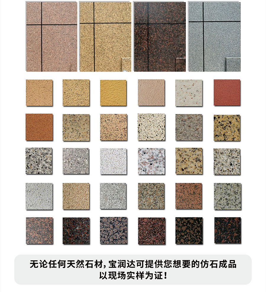 寶潤(rùn)達(dá)一體板飾面層采用真石漆,多彩漆,水包水,水包砂,乳膠漆,實(shí)色/金屬氟碳超3000種顏色定制,可根據(jù)石材定做樣品
